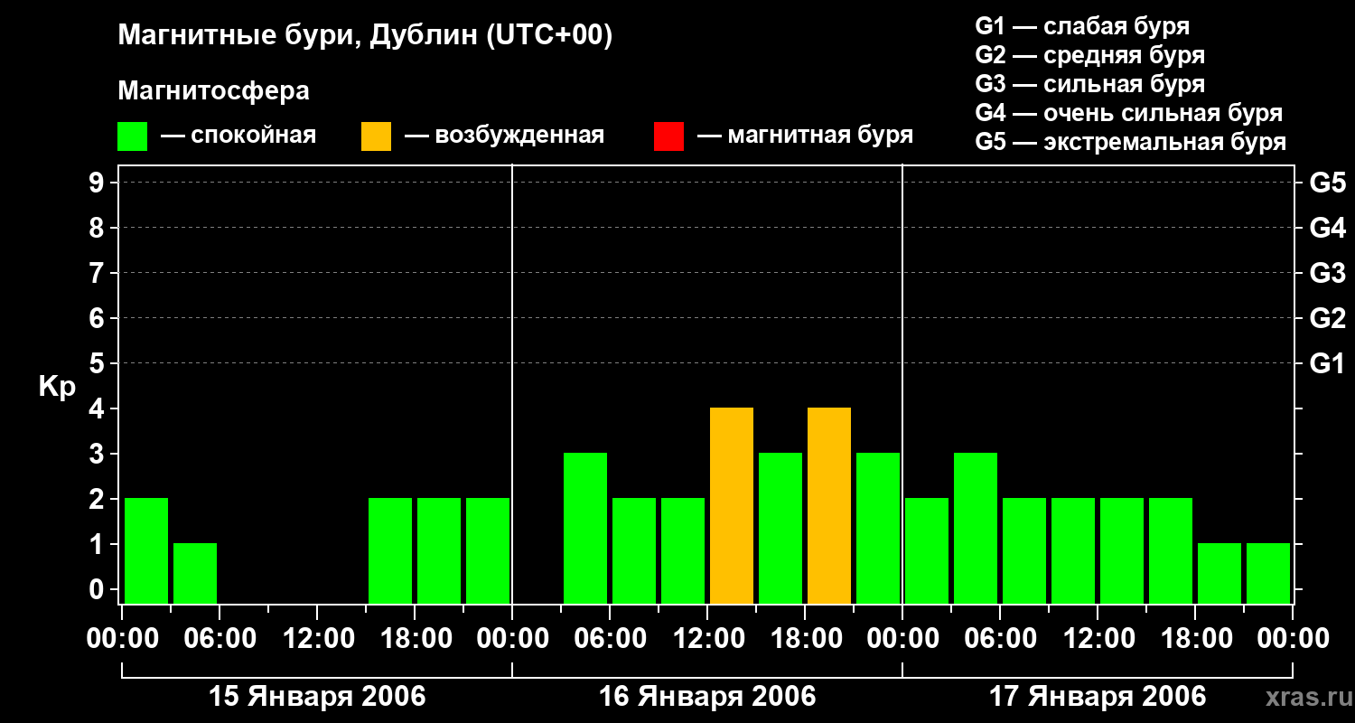 Изменения геомагнитного индекса Kp с 15 по 17 января 2006 года для средних широт