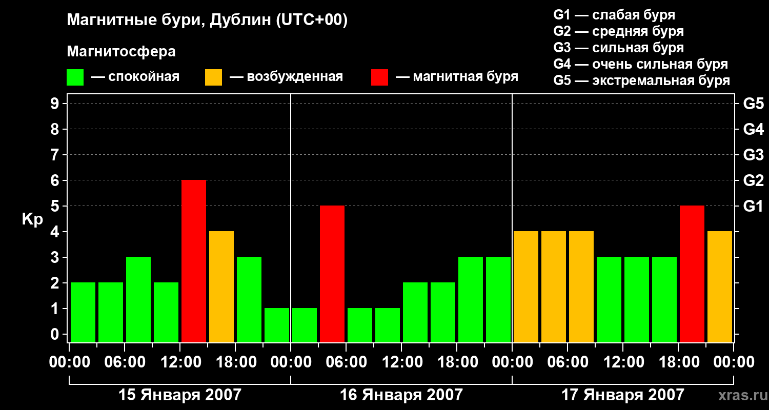 Изменения геомагнитного индекса Kp с 15 по 17 января 2007 года для средних широт