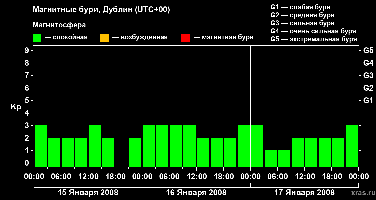 Изменения геомагнитного индекса Kp с 15 по 17 января 2008 года для средних широт