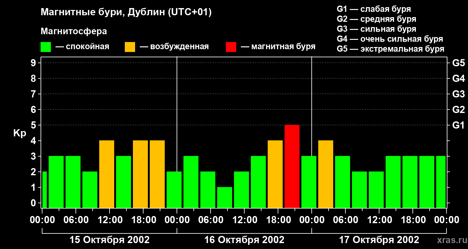 Изменения геомагнитного индекса Kp с 15 по 17 октября 2002 года для средних широт