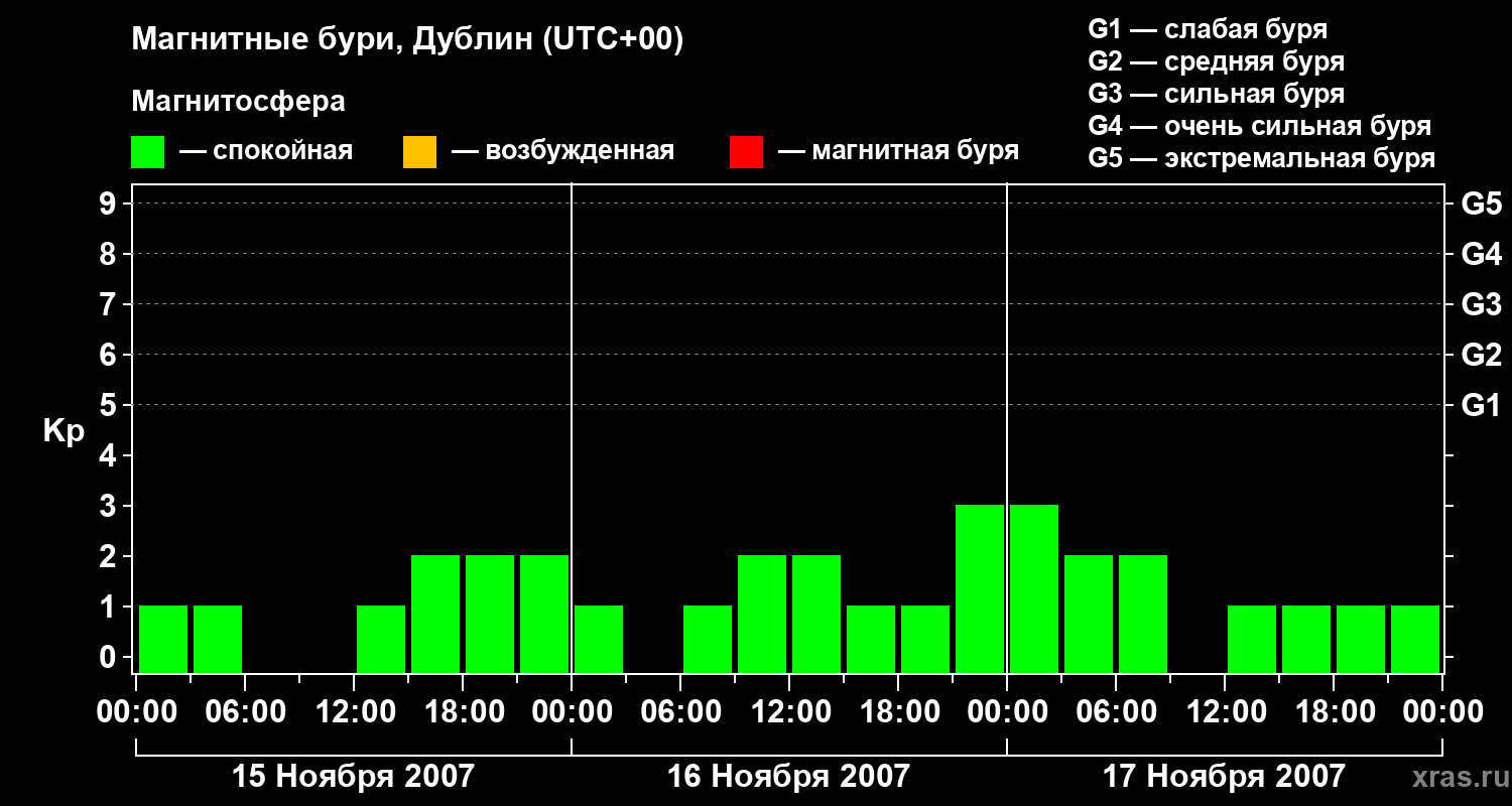 Изменения геомагнитного индекса Kp с 15 по 17 ноября 2007 года для средних широт