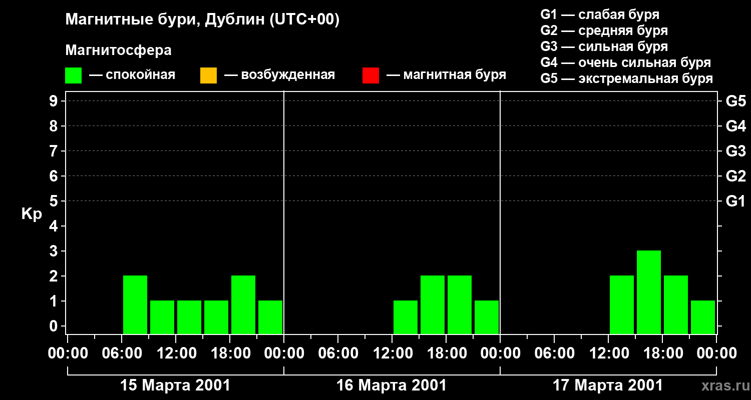 Изменения геомагнитного индекса Kp с 15 по 17 марта 2001 года для средних широт