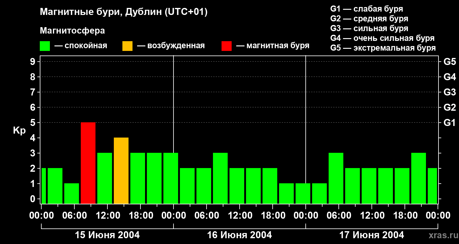 Изменения геомагнитного индекса Kp с 15 по 17 июня 2004 года для средних широт