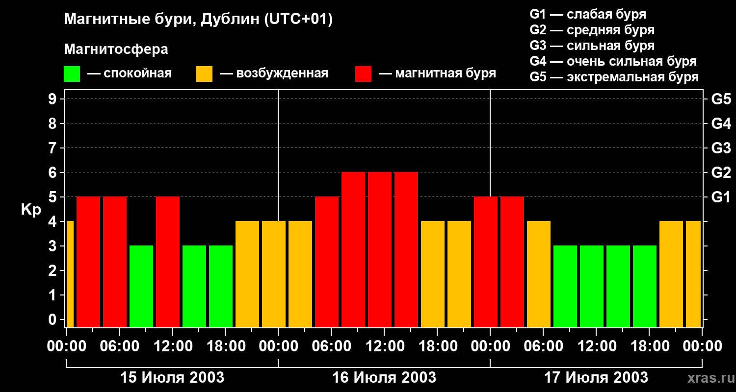 Изменения геомагнитного индекса Kp с 15 по 17 июля 2003 года для средних широт