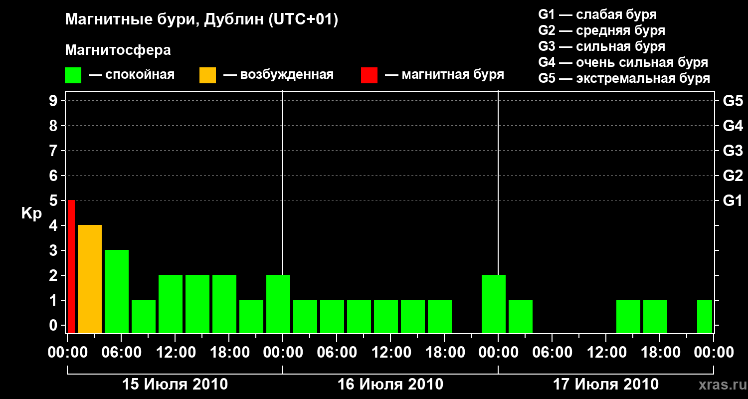 Изменения геомагнитного индекса Kp с 15 по 17 июля 2010 года для средних широт