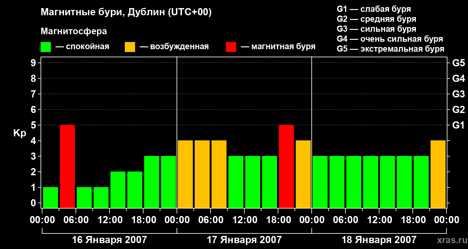Изменения геомагнитного индекса Kp с 16 по 18 января 2007 года для средних широт