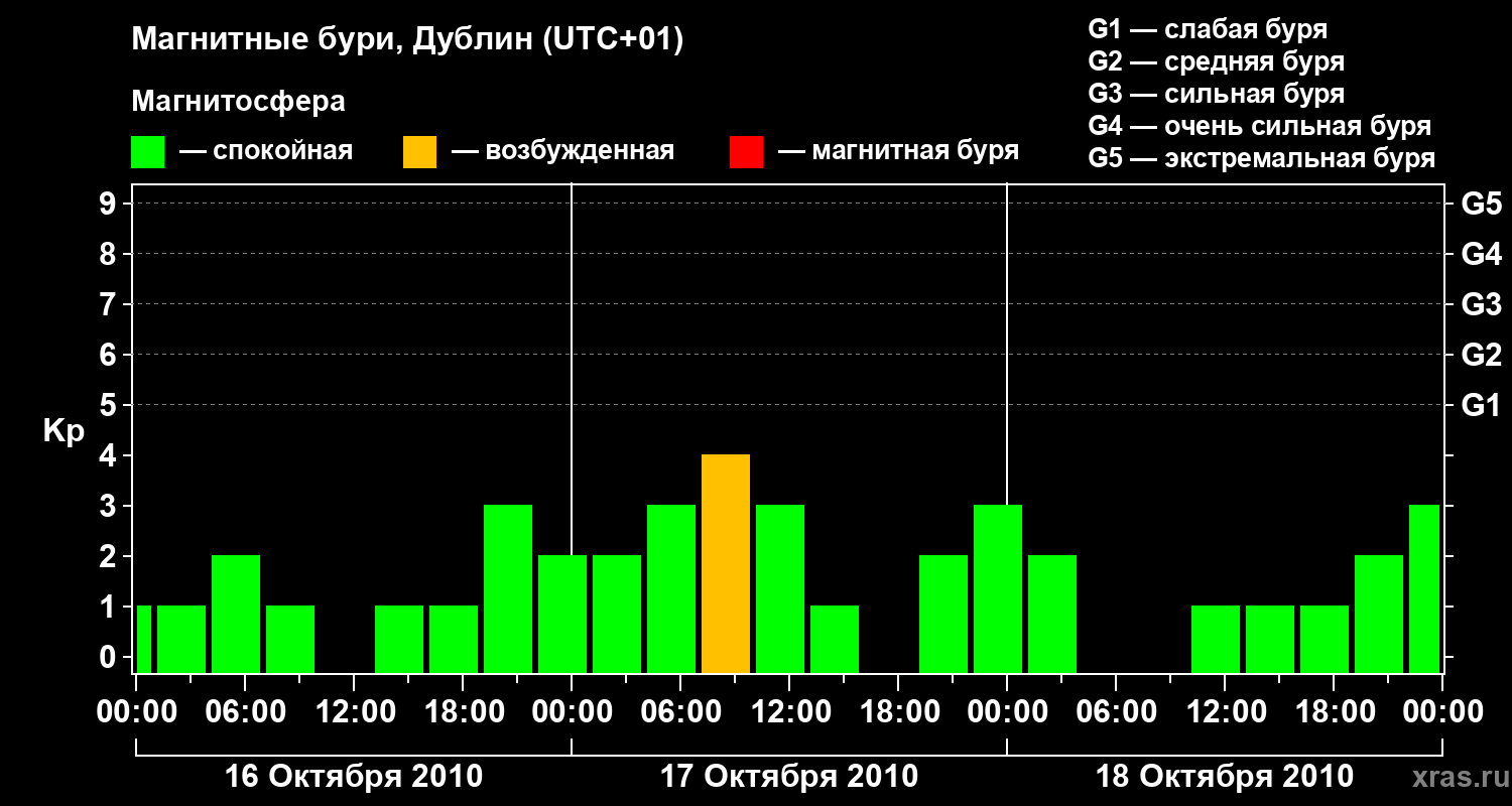 Изменения геомагнитного индекса Kp с 16 по 18 октября 2010 года для средних широт