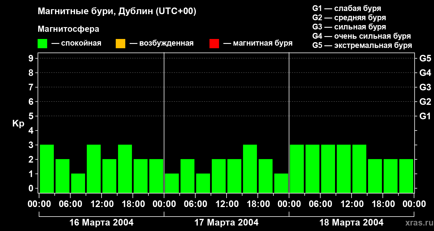 Изменения геомагнитного индекса Kp с 16 по 18 марта 2004 года для средних широт