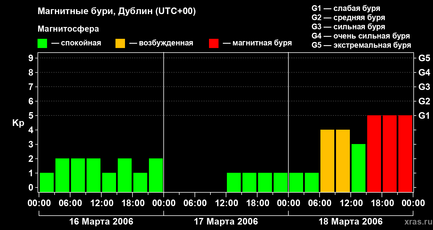 Изменения геомагнитного индекса Kp с 16 по 18 марта 2006 года для средних широт