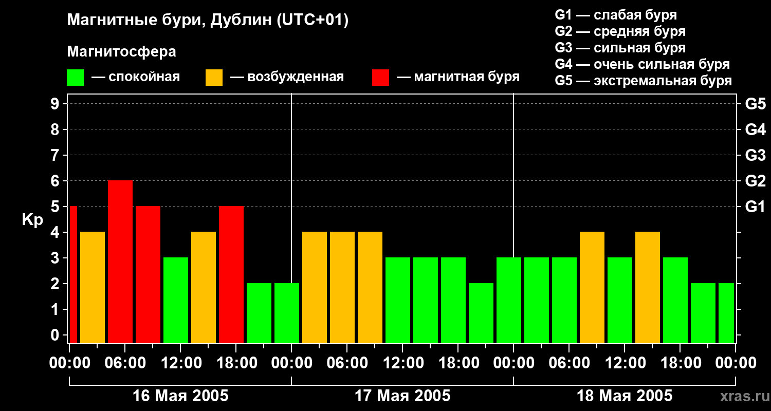 Изменения геомагнитного индекса Kp с 16 по 18 мая 2005 года для средних широт
