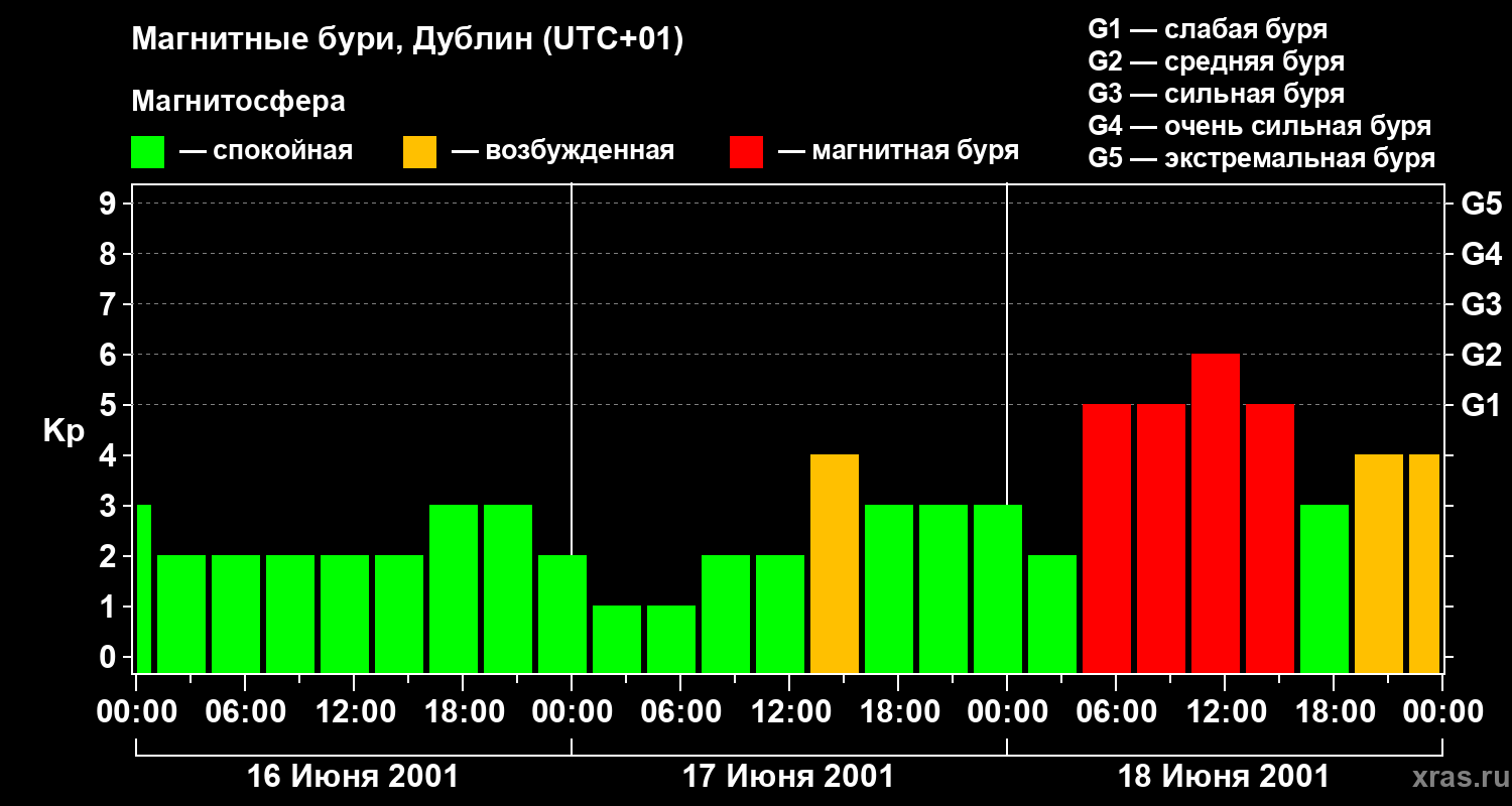 Изменения геомагнитного индекса Kp с 16 по 18 июня 2001 года для средних широт