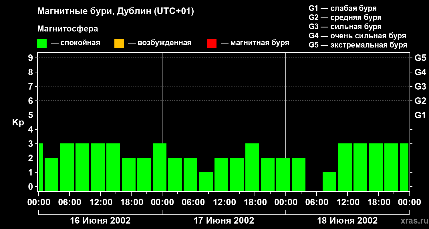 Изменения геомагнитного индекса Kp с 16 по 18 июня 2002 года для средних широт
