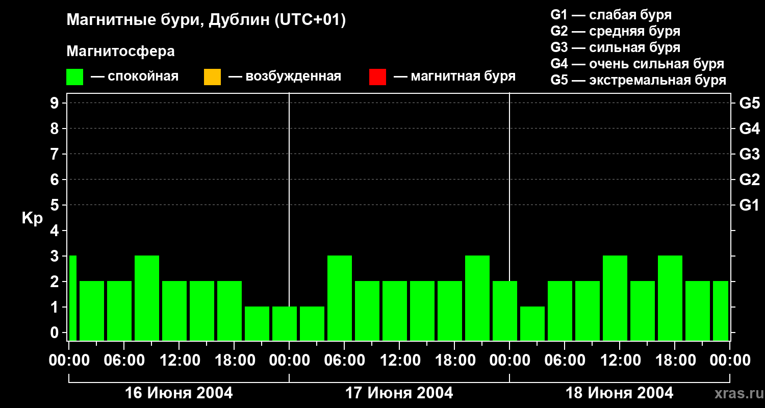 Изменения геомагнитного индекса Kp с 16 по 18 июня 2004 года для средних широт