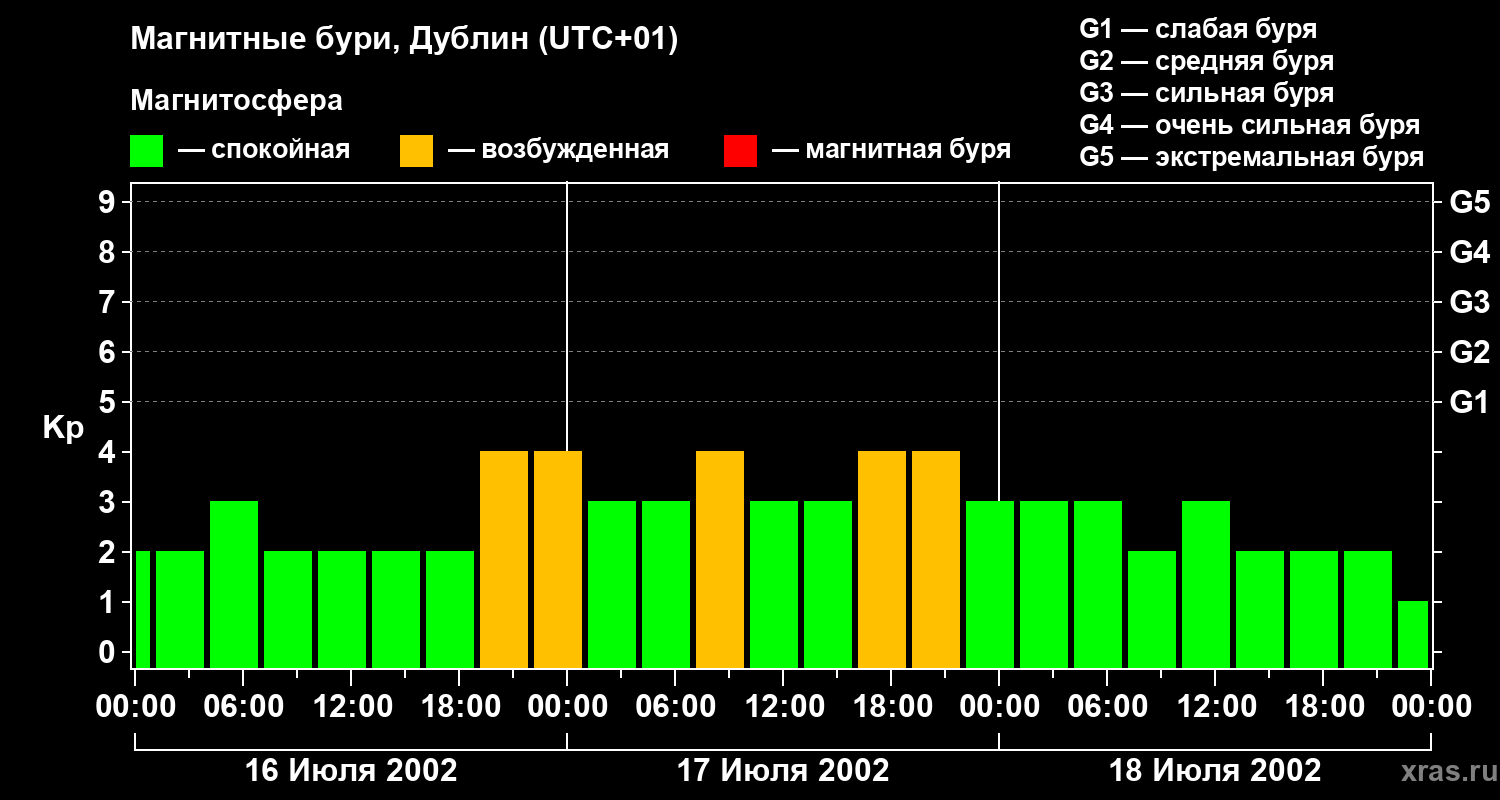 Изменения геомагнитного индекса Kp с 16 по 18 июля 2002 года для средних широт