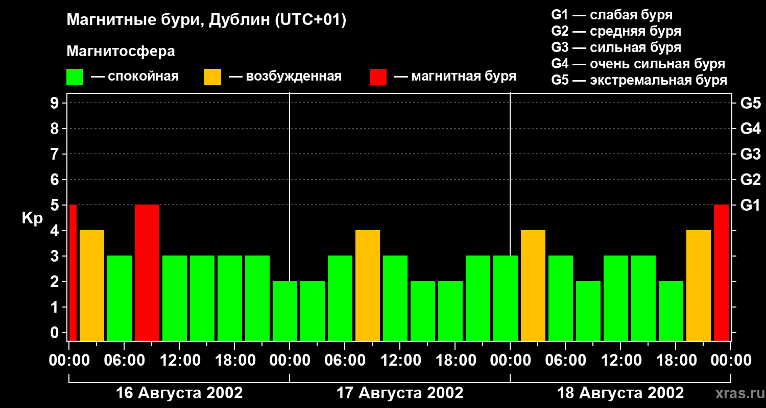 Изменения геомагнитного индекса Kp с 16 по 18 августа 2002 года для средних широт