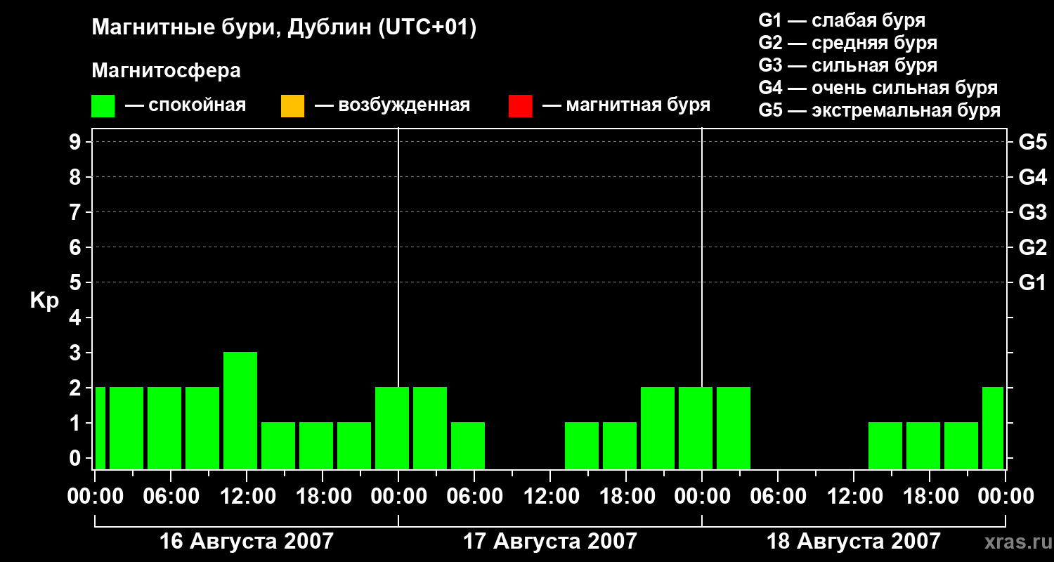Изменения геомагнитного индекса Kp с 16 по 18 августа 2007 года для средних широт