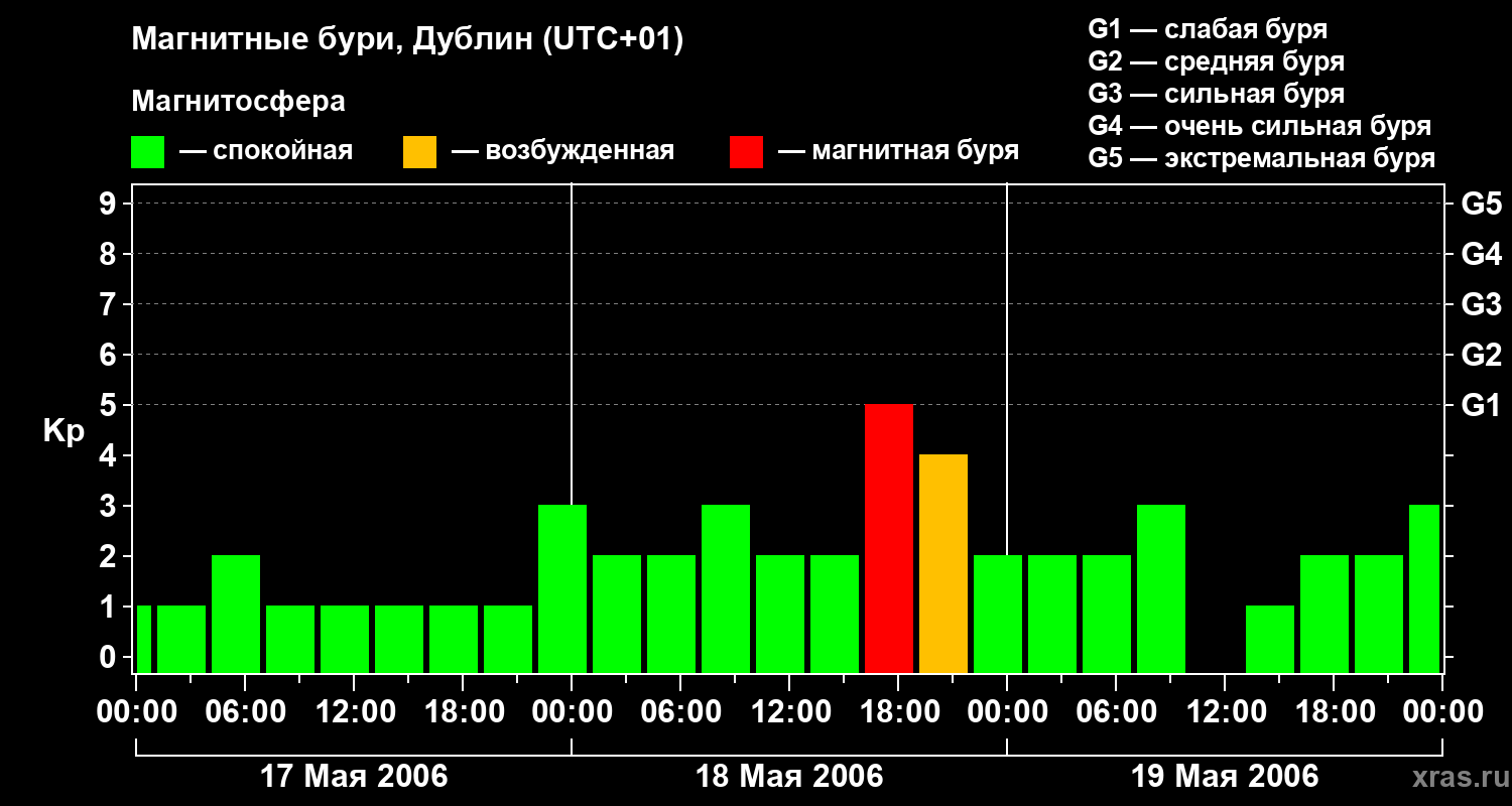 Изменения геомагнитного индекса Kp с 17 по 19 мая 2006 года для средних широт