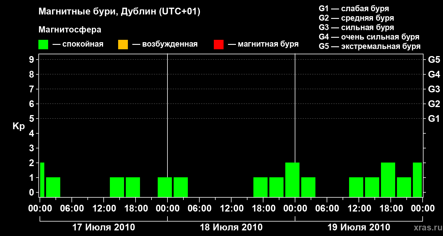 Изменения геомагнитного индекса Kp с 17 по 19 июля 2010 года для средних широт