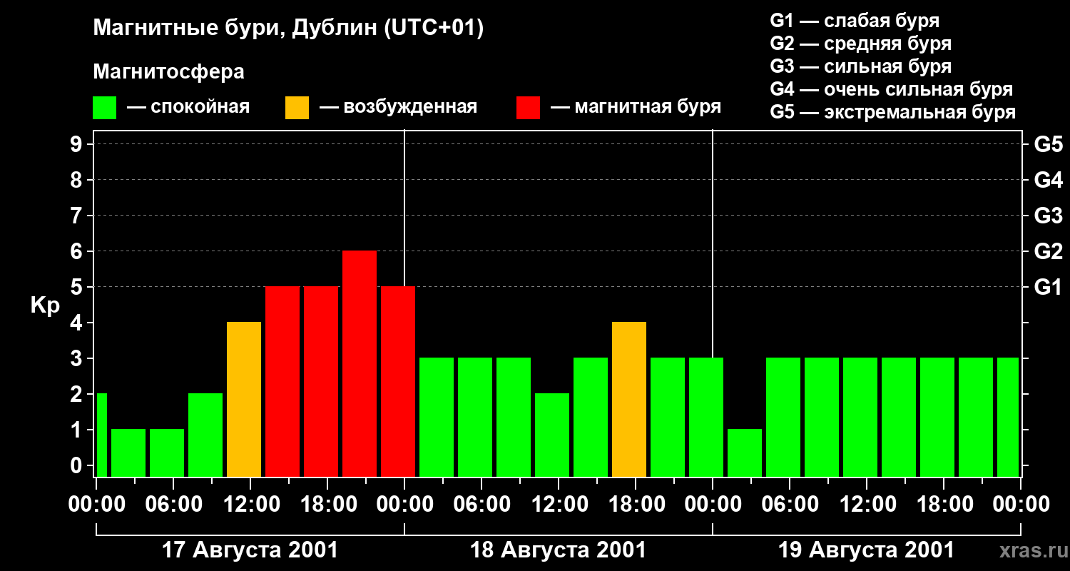 Изменения геомагнитного индекса Kp с 17 по 19 августа 2001 года для средних широт