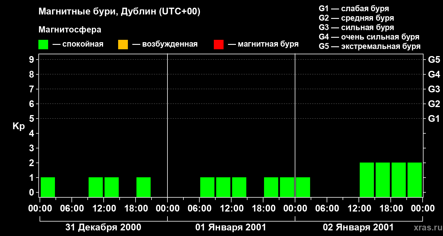 Изменения геомагнитного индекса Kp с 31 декабря 2000 года по 2 января 2001 года для средних широт