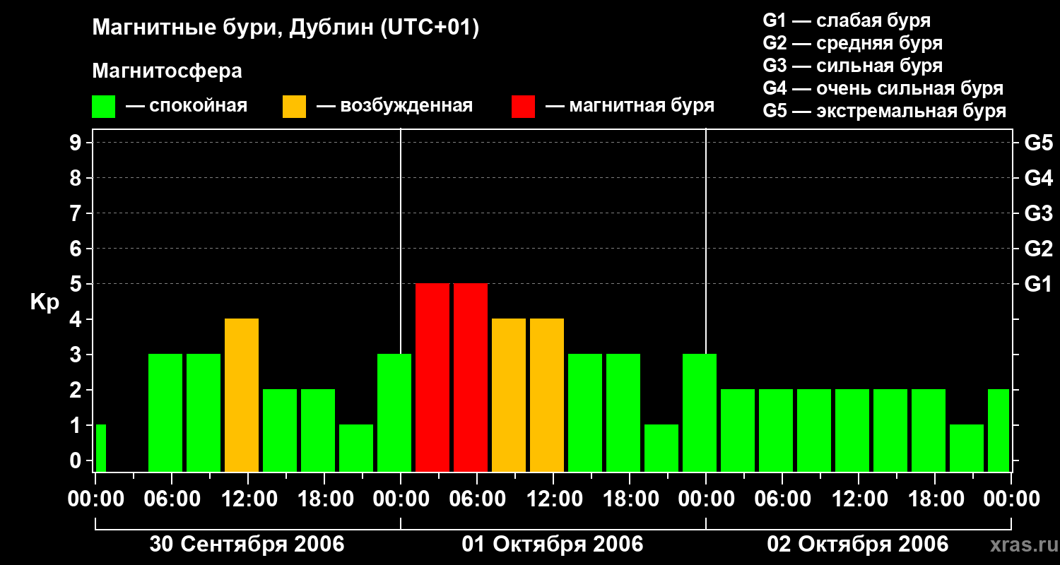 Изменения геомагнитного индекса Kp с 30 сентября по 2 октября 2006 года для средних широт