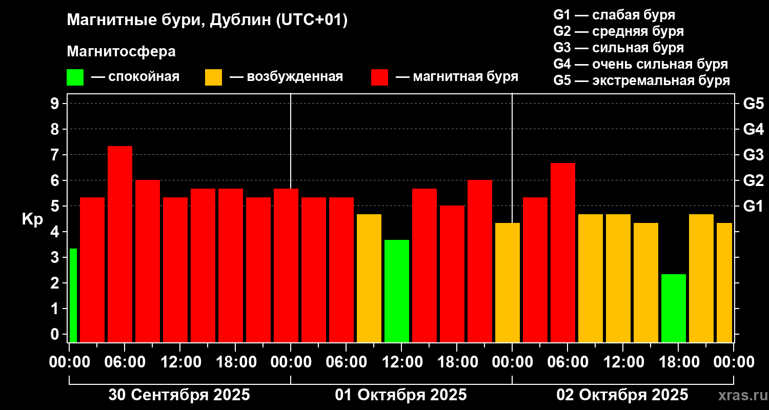 Изменения геомагнитного индекса Kp с 30 сентября по 2 октября 2025 года для средних широт