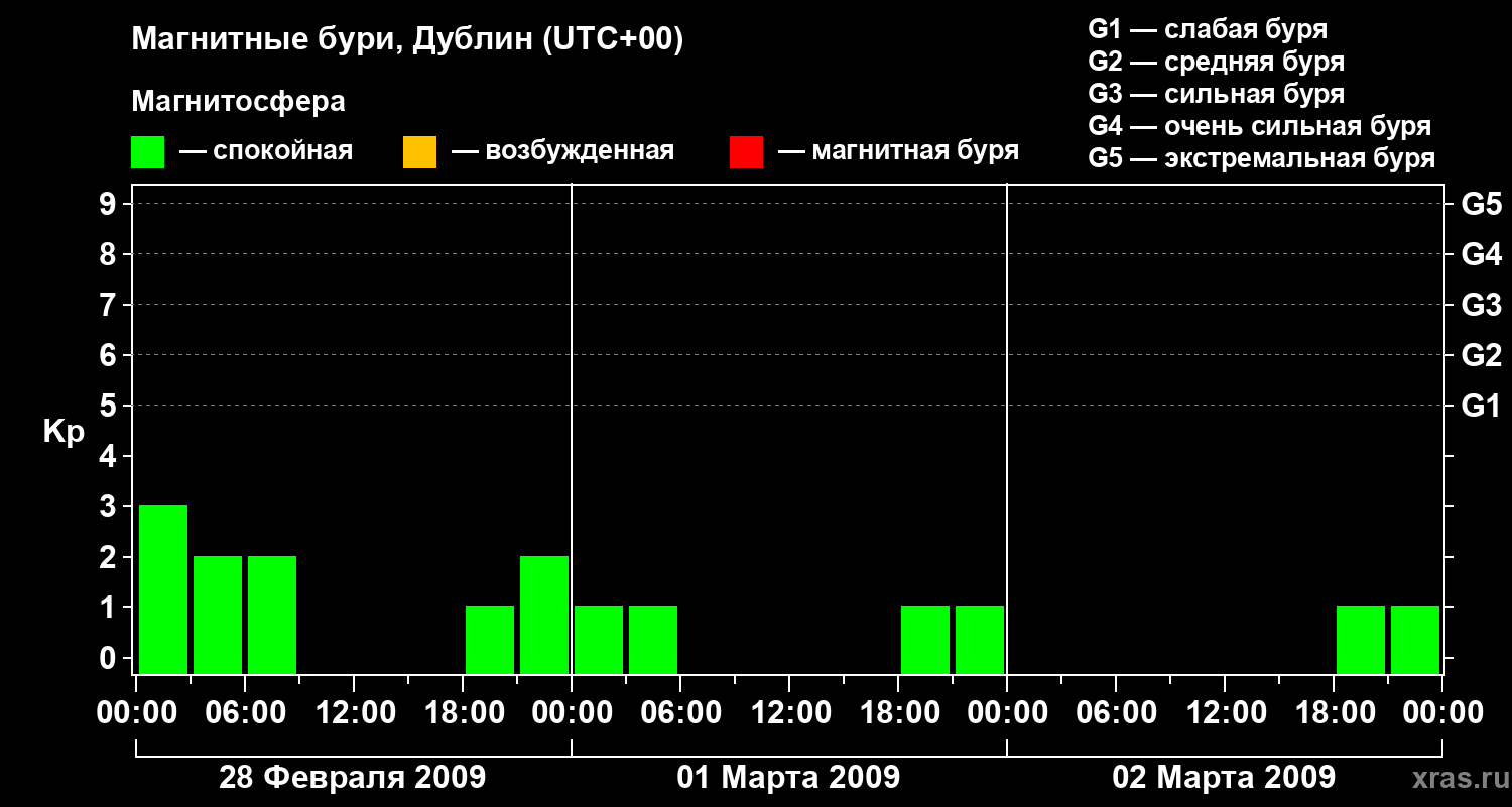 Изменения геомагнитного индекса Kp с 28 февраля по 2 марта 2009 года для средних широт