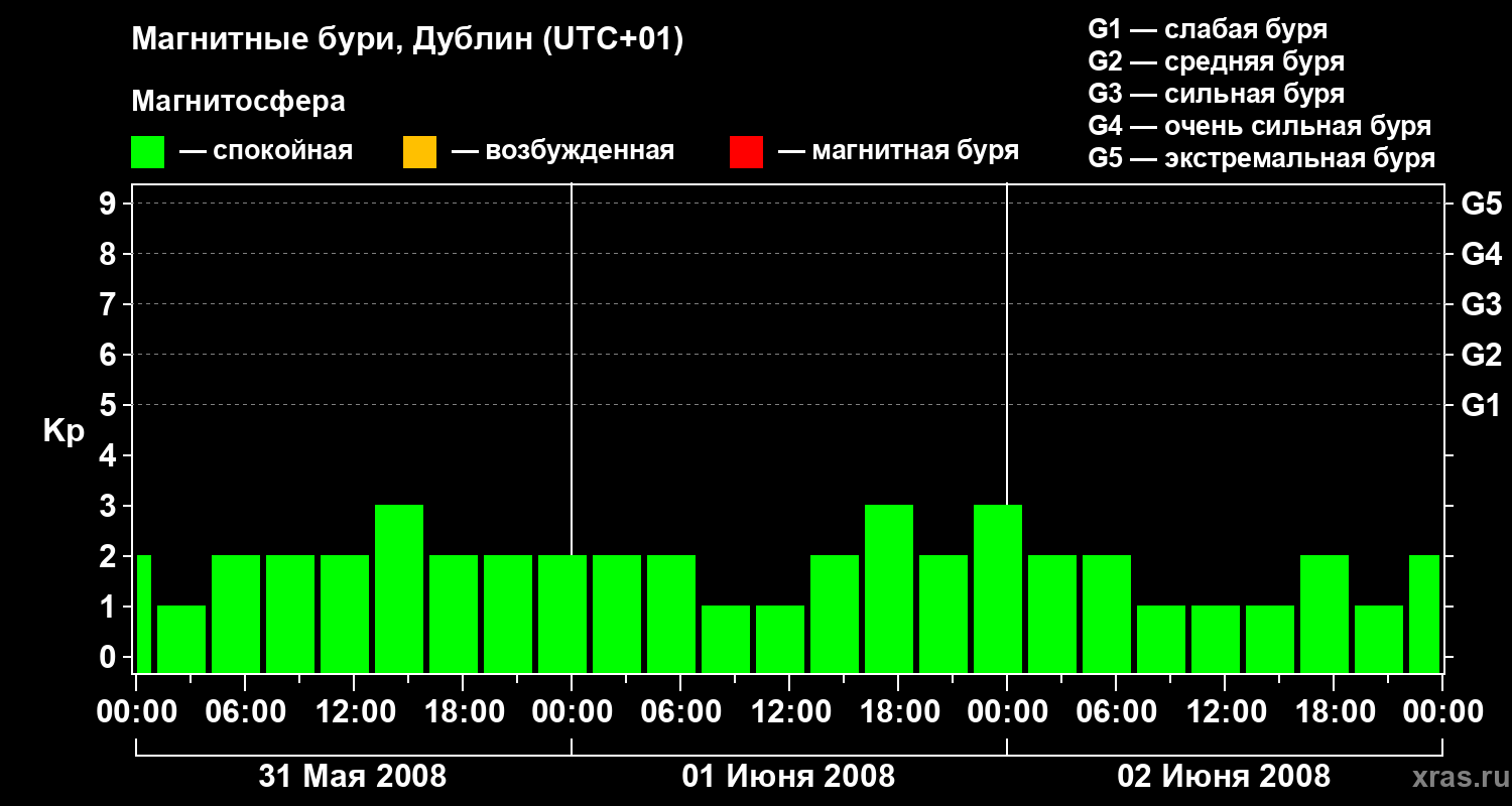Изменения геомагнитного индекса Kp с 31 мая по 2 июня 2008 года для средних широт