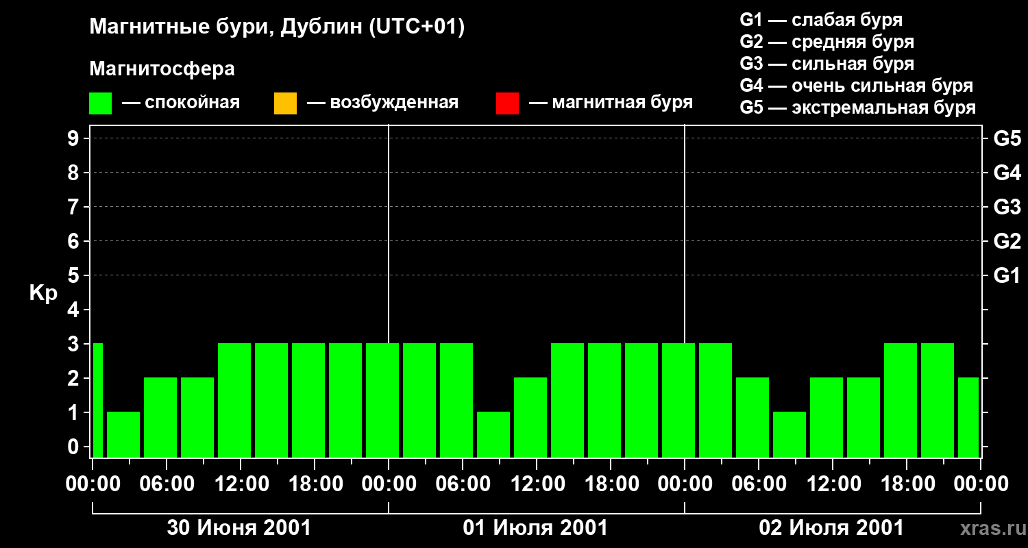 Изменения геомагнитного индекса Kp с 30 июня по 2 июля 2001 года для средних широт