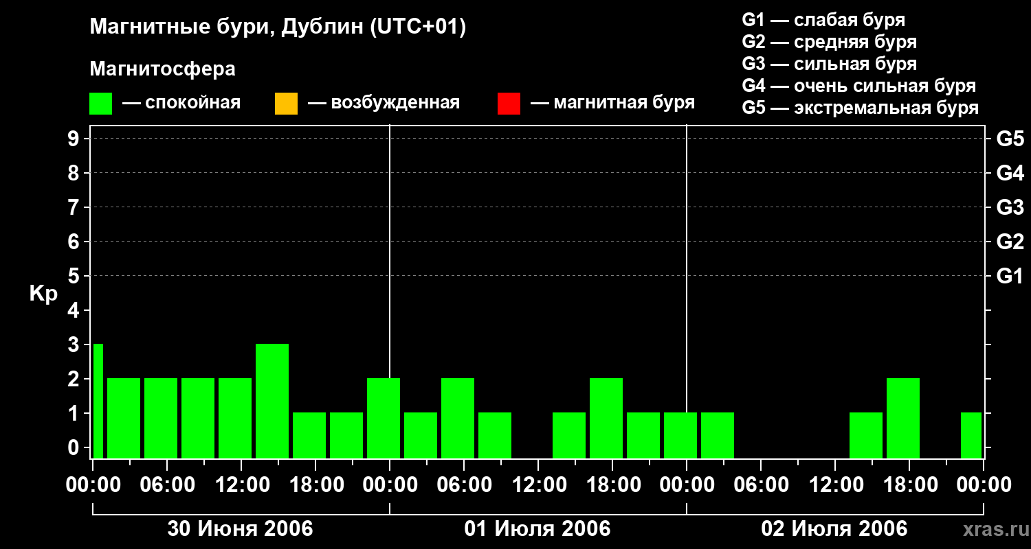 Изменения геомагнитного индекса Kp с 30 июня по 2 июля 2006 года для средних широт