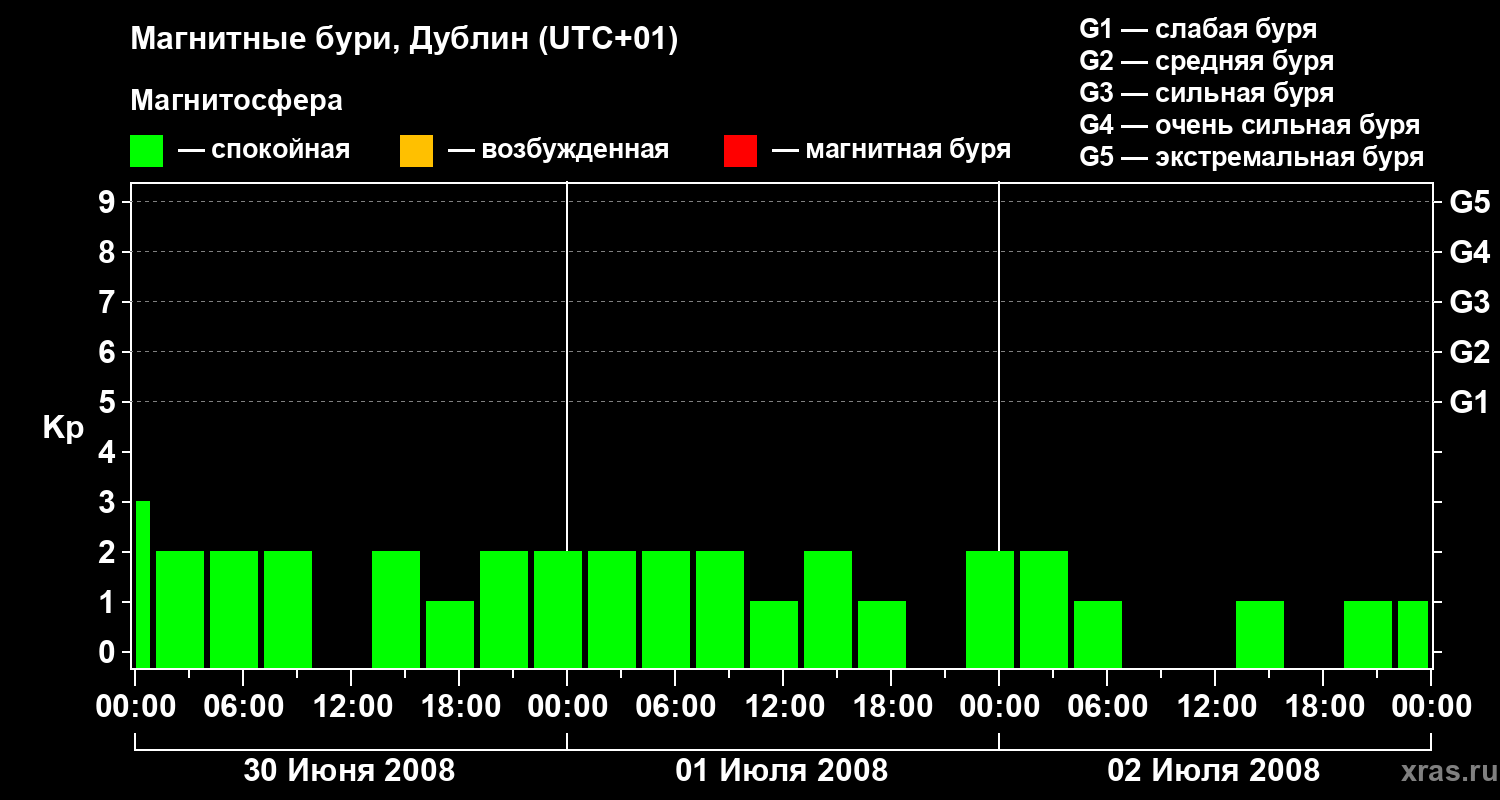 Изменения геомагнитного индекса Kp с 30 июня по 2 июля 2008 года для средних широт