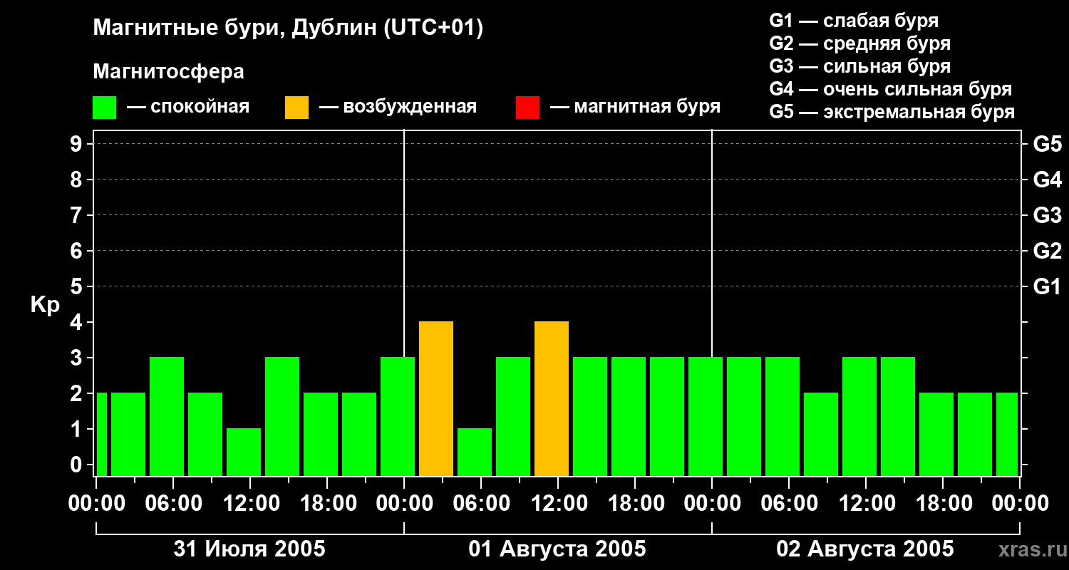 Изменения геомагнитного индекса Kp с 31 июля по 2 августа 2005 года для средних широт