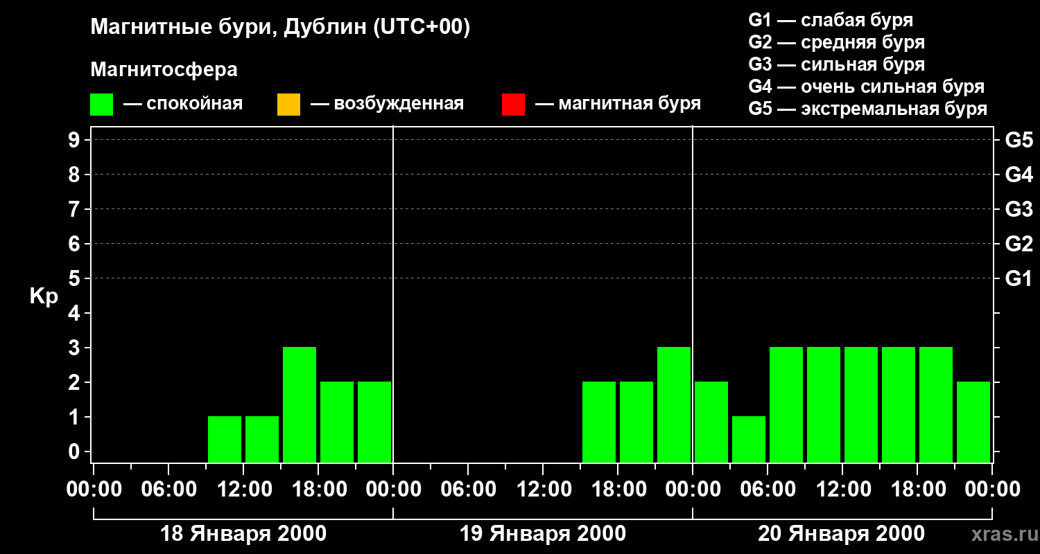 Изменения геомагнитного индекса Kp с 18 по 20 января 2000 года для средних широт