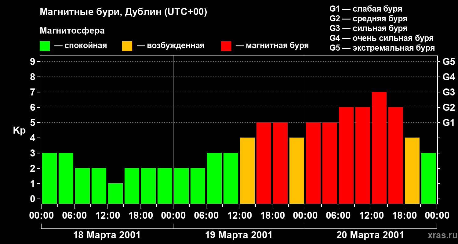 Изменения геомагнитного индекса Kp с 18 по 20 марта 2001 года для средних широт