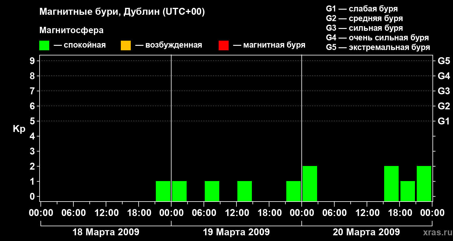 Изменения геомагнитного индекса Kp с 18 по 20 марта 2009 года для средних широт