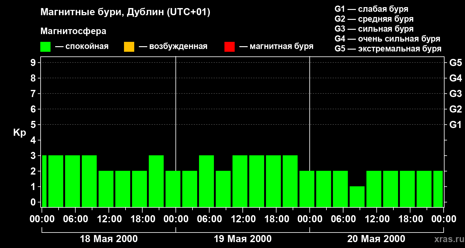 Изменения геомагнитного индекса Kp с 18 по 20 мая 2000 года для средних широт
