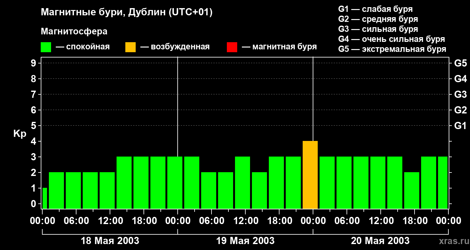Изменения геомагнитного индекса Kp с 18 по 20 мая 2003 года для средних широт