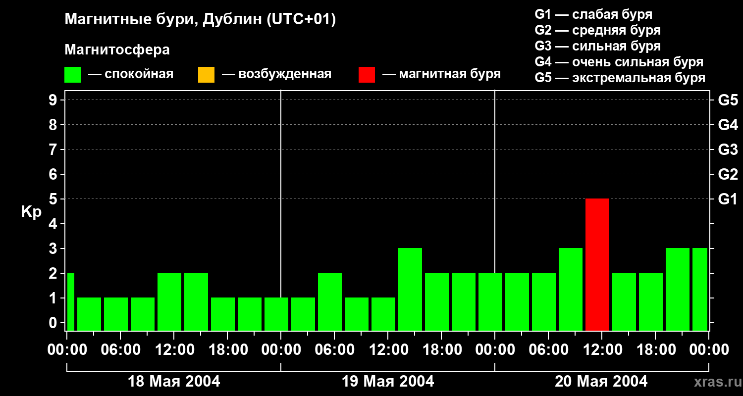 Изменения геомагнитного индекса Kp с 18 по 20 мая 2004 года для средних широт