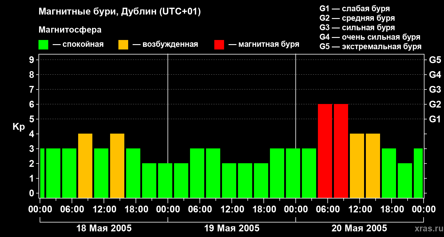 Изменения геомагнитного индекса Kp с 18 по 20 мая 2005 года для средних широт