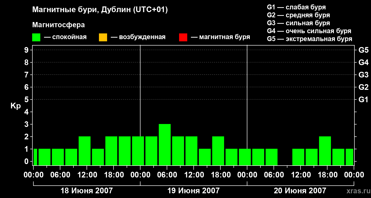 Изменения геомагнитного индекса Kp с 18 по 20 июня 2007 года для средних широт