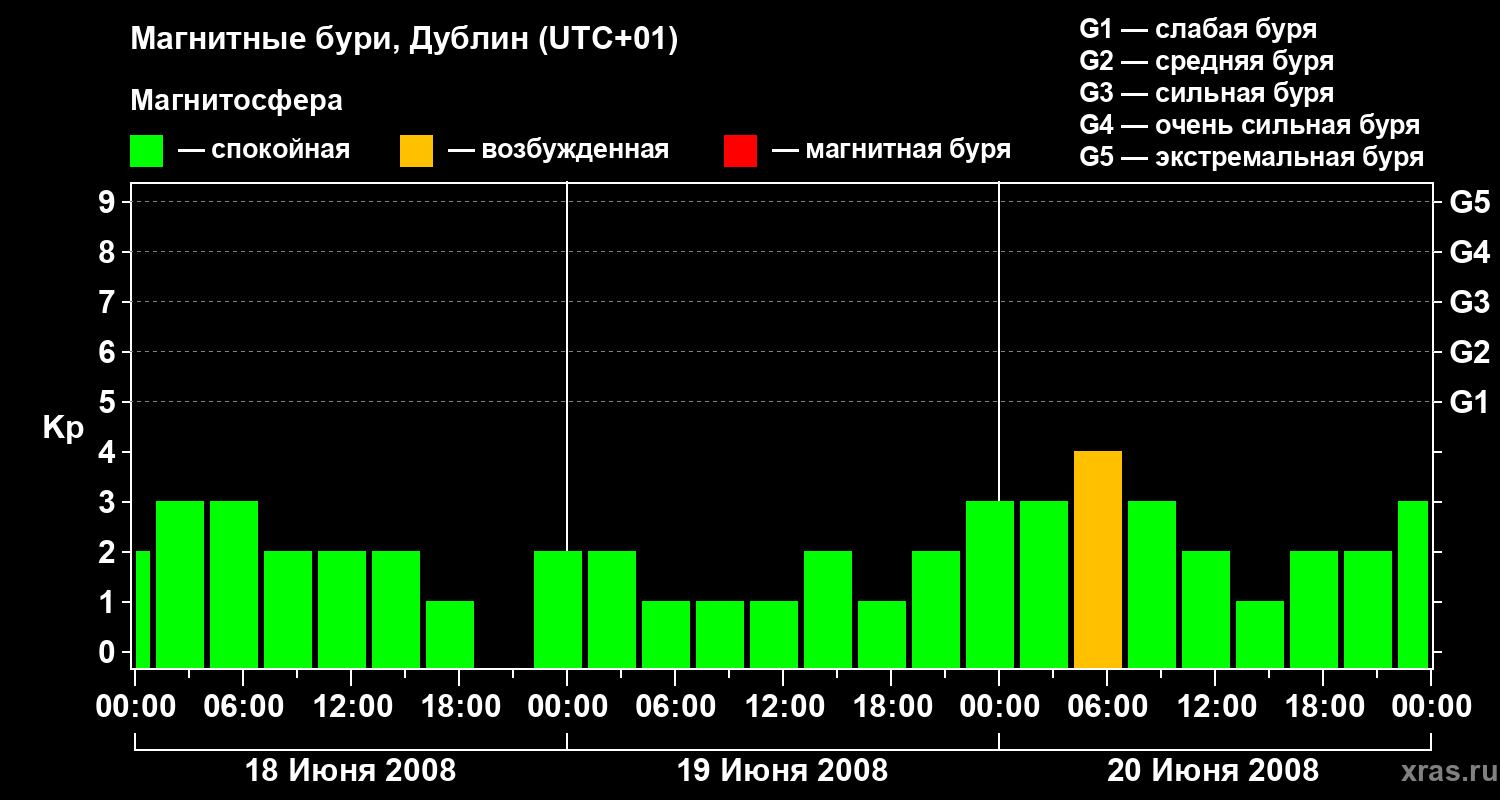 Изменения геомагнитного индекса Kp с 18 по 20 июня 2008 года для средних широт