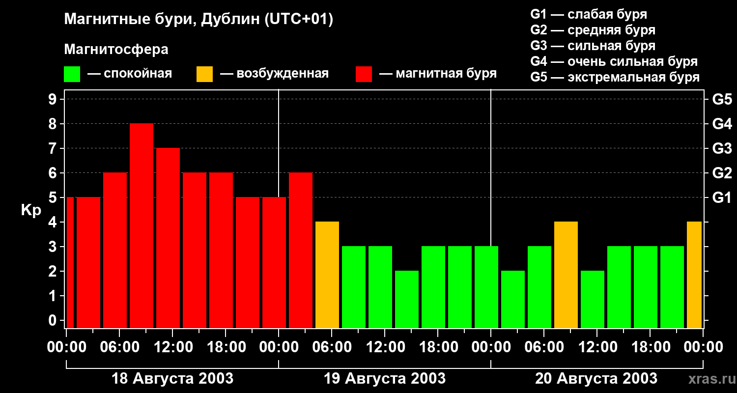 Изменения геомагнитного индекса Kp с 18 по 20 августа 2003 года для средних широт