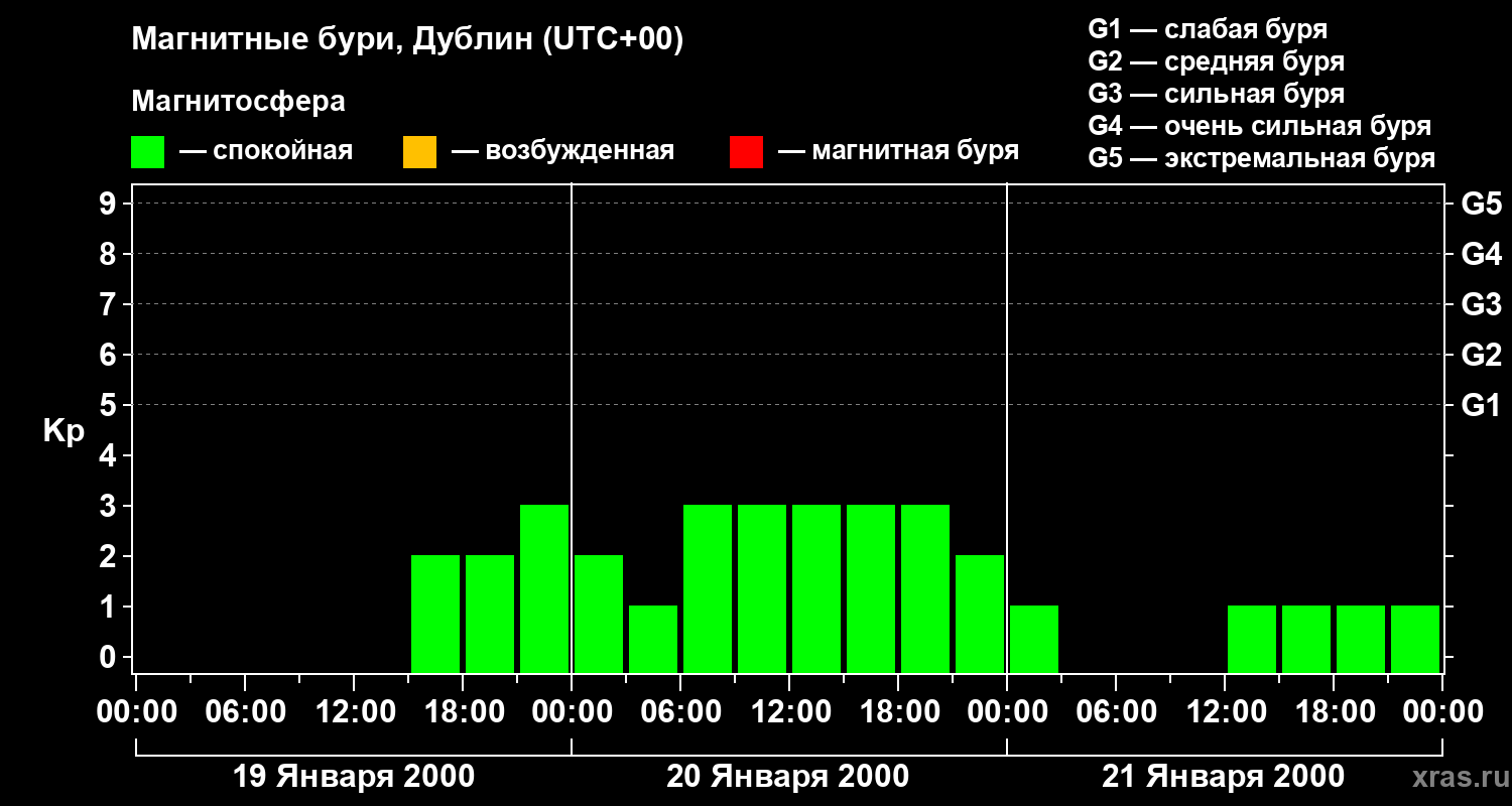 Изменения геомагнитного индекса Kp с 19 по 21 января 2000 года для средних широт
