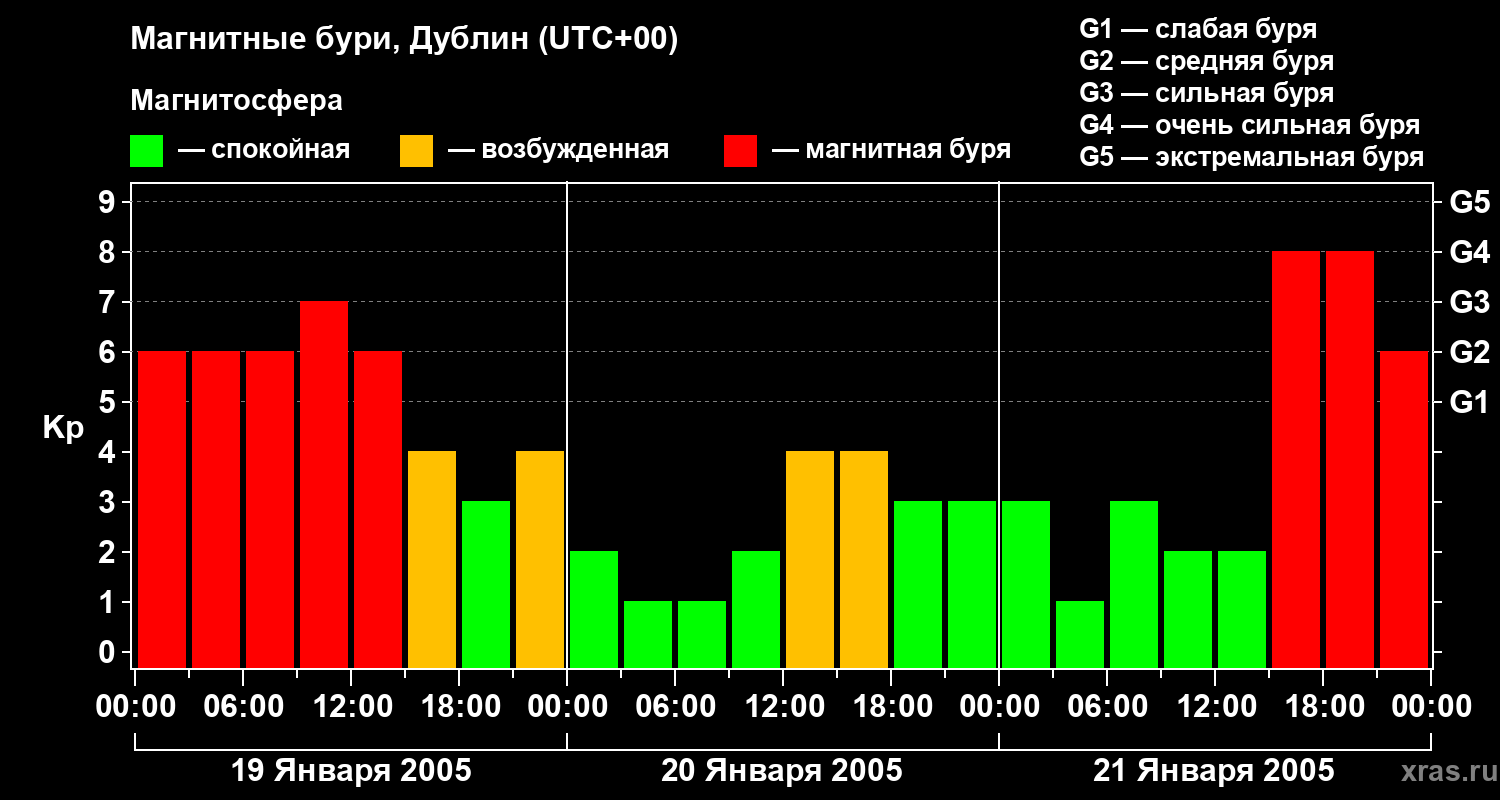 Изменения геомагнитного индекса Kp с 19 по 21 января 2005 года для средних широт