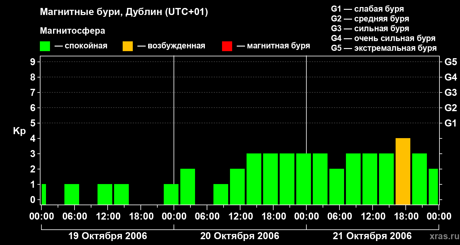 Изменения геомагнитного индекса Kp с 19 по 21 октября 2006 года для средних широт