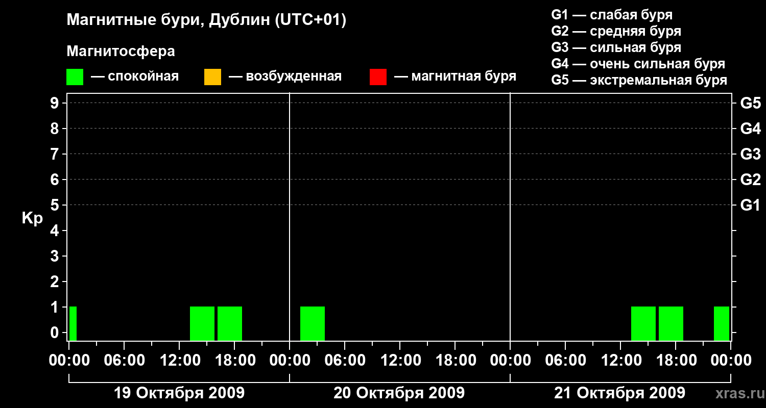 Изменения геомагнитного индекса Kp с 19 по 21 октября 2009 года для средних широт