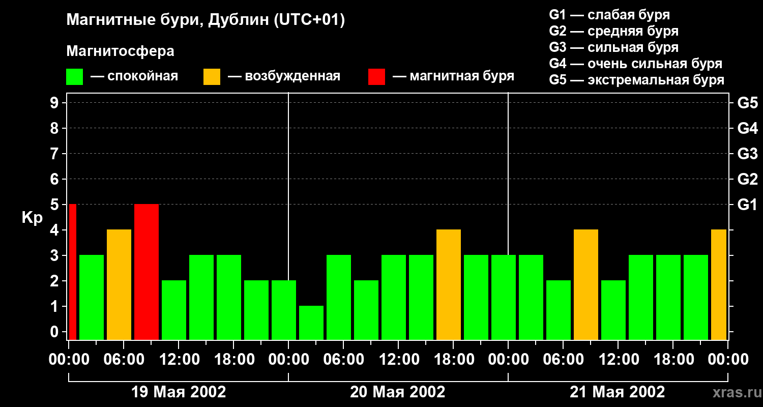 Изменения геомагнитного индекса Kp с 19 по 21 мая 2002 года для средних широт
