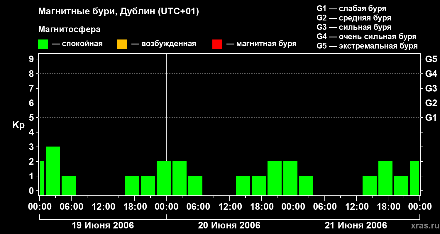 Изменения геомагнитного индекса Kp с 19 по 21 июня 2006 года для средних широт
