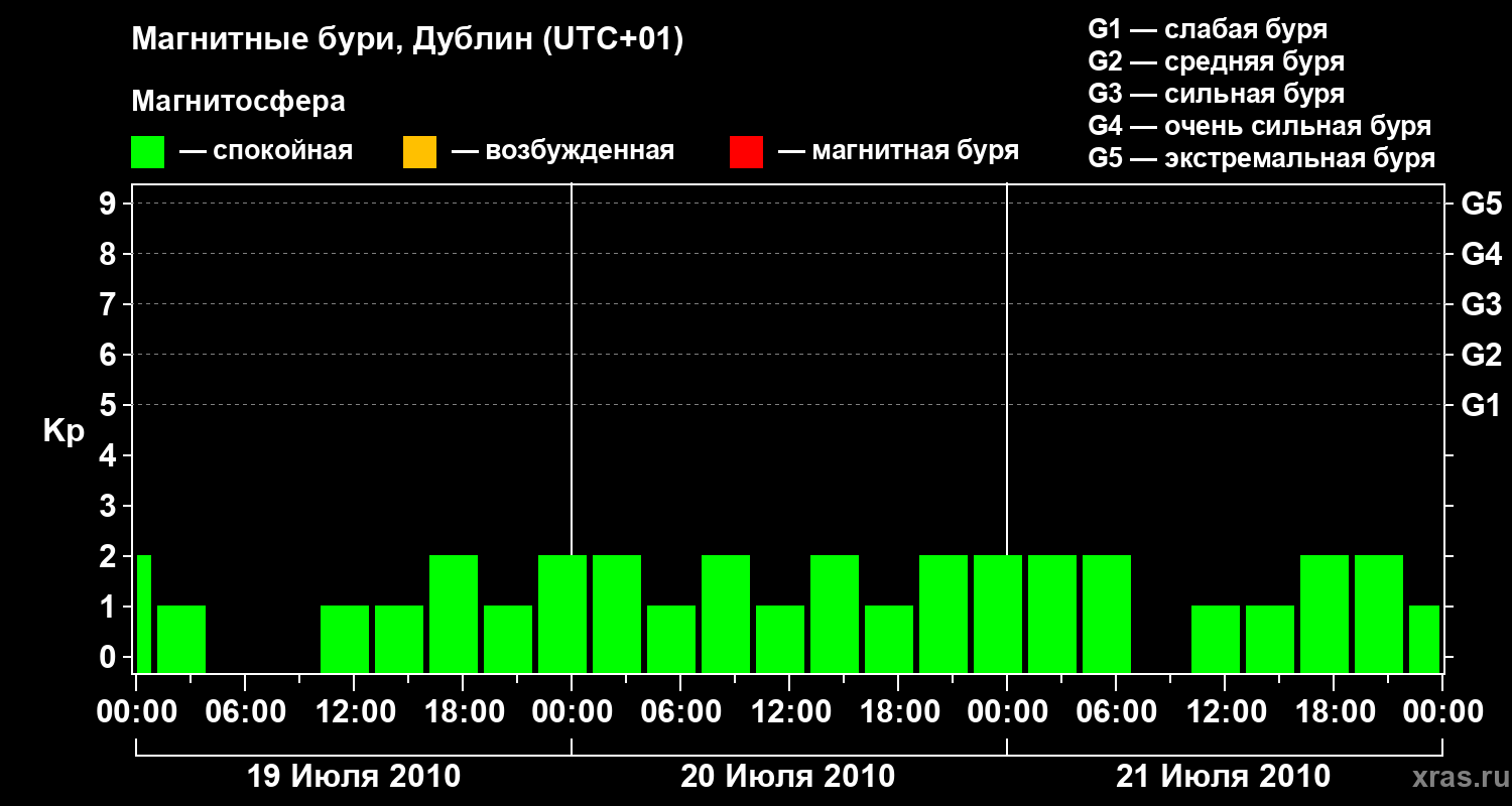 Изменения геомагнитного индекса Kp с 19 по 21 июля 2010 года для средних широт