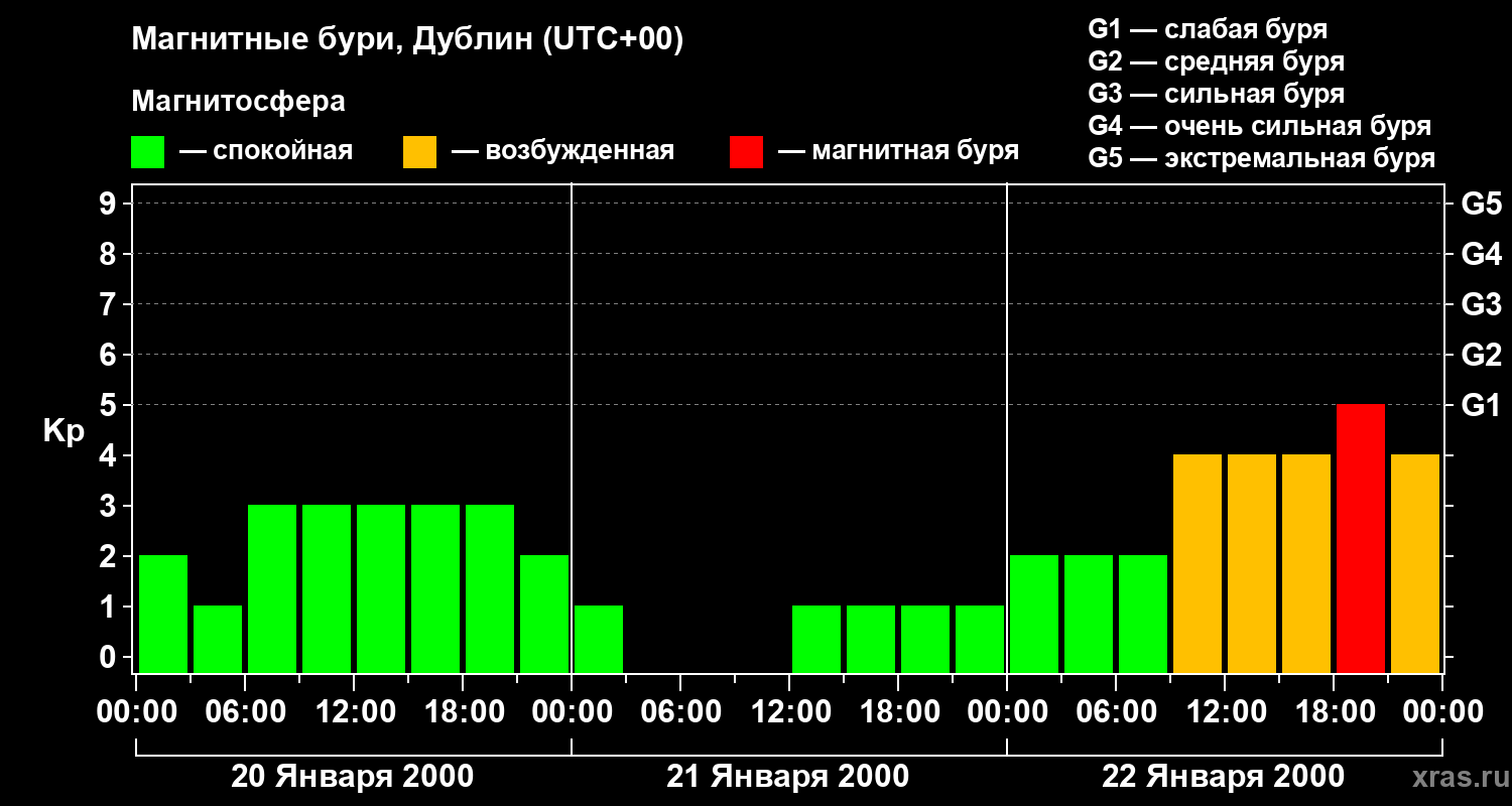 Изменения геомагнитного индекса Kp с 20 по 22 января 2000 года для средних широт